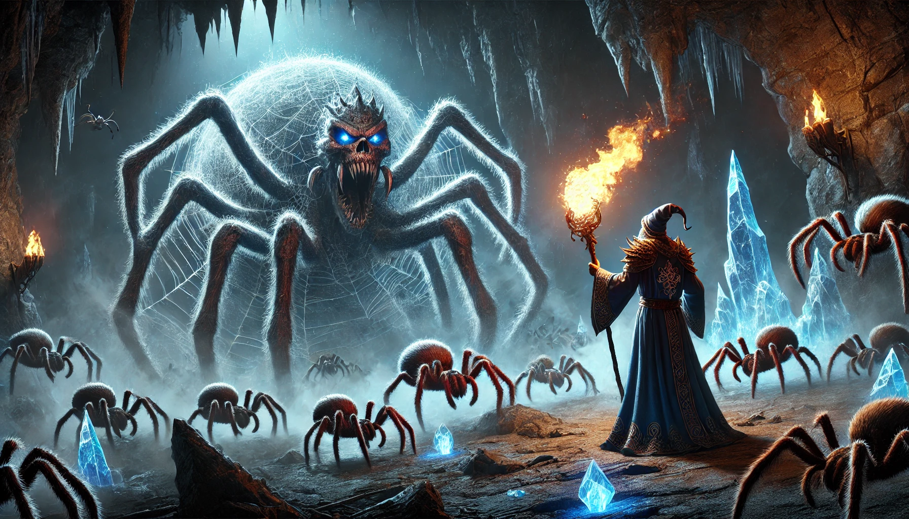 마법사가 강력한 빛과 얼음 마법을 던지고 거미 여왕과 그녀의 무리를 상대할 준비를 하는 어두운 동굴의 긴장감 넘치는 장면. 동굴은 마법사의 주문에서 섬뜩한 빛으로 희미하게 밝혀져 괴물 같은 거미 여왕과 그녀의 많은 거미들이 공격할 준비를 하고 있습니다. 신비로운 예복을 입은 마법사는 밝은 빛과 얼음을 내뿜는 직원과 함께 단호하게 서 있고, 위협적인 송곳니와 수많은 다리를 가진 거미 여왕은 위협적으로 나아갑니다.