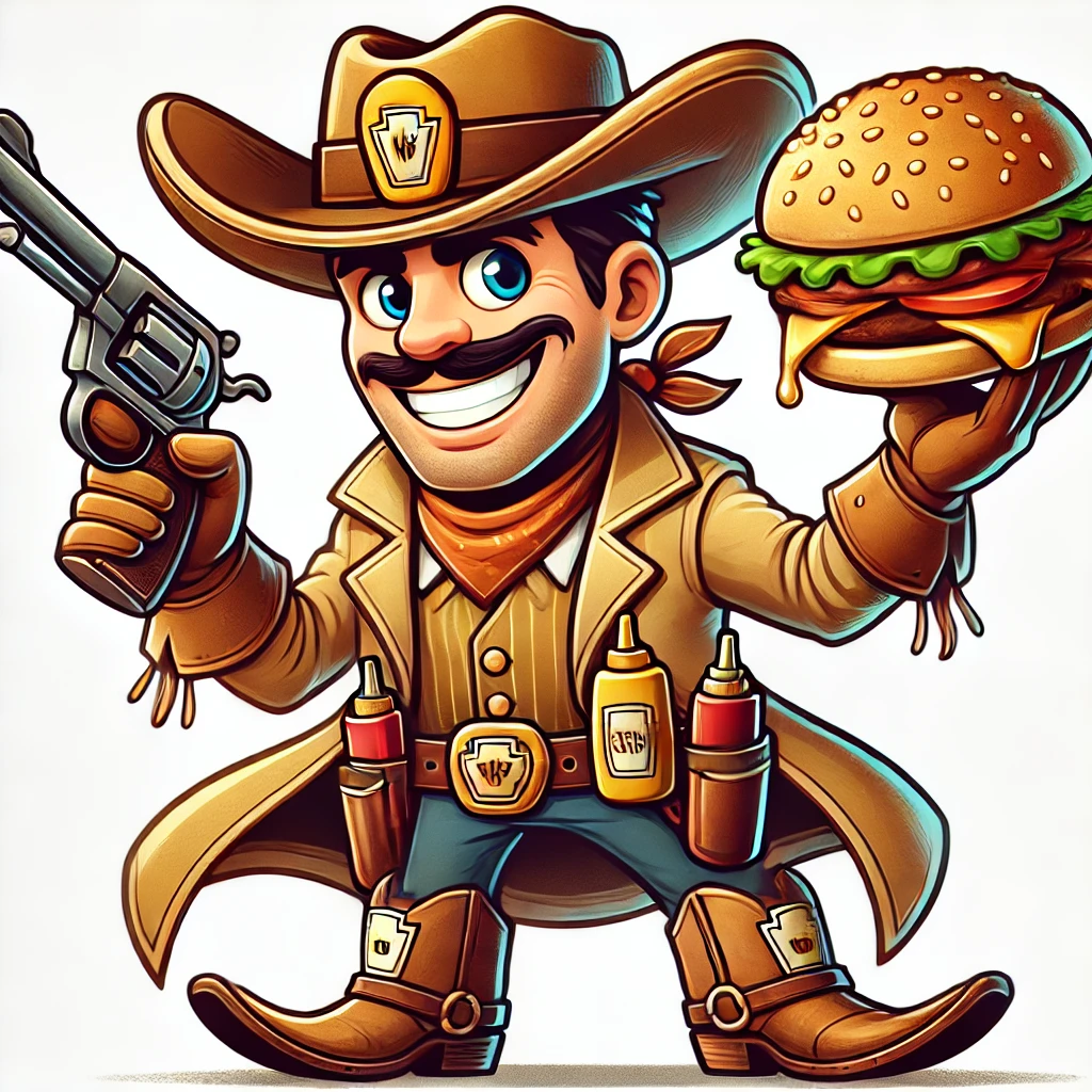 외모: 햄버거 모양의 카우보이 모자를 쓴 남성. 그는 구리빛 태양에 그을린 얼굴과 늘 웃고 있는 미소를 가지고 있으며, 그의 큰 손은 두꺼운 가죽장갑을 끼고 있어요. 옷은 전형적인 카우보이 복장인데, 황금빛 햄버거를 상징하는 금색과 갈색 테마로 디자인되어 있습니다. 허리에 있는 총집에는 햄버거 재료를 쏠 수 있는 케첩과 머스터드 권총이 준비되어 있죠. 신발은 소의 가죽으로 만들어진 카우보이 부츠.